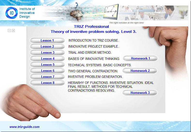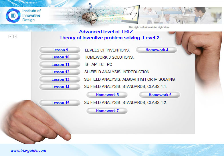 Institute of Innovative Design provides full set of tutorial on TRIZ, FCA, Innovative Design, Improvement of creative imagination by true TRIZ Master Dr.Y.Salamatov including DVD disks. There are 3 level of tutorial: