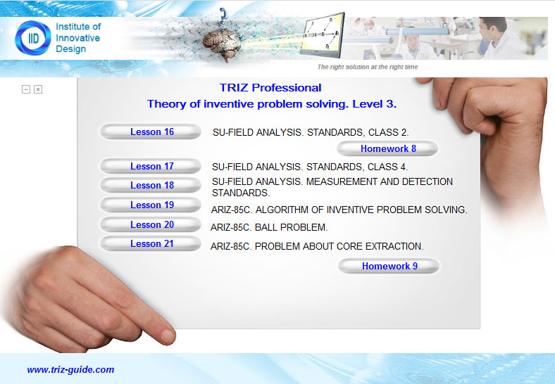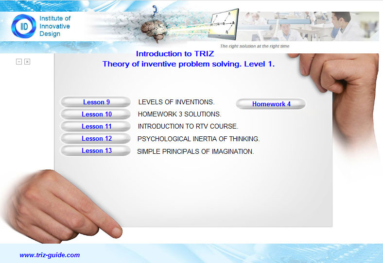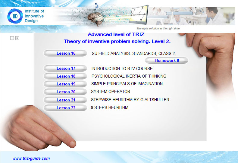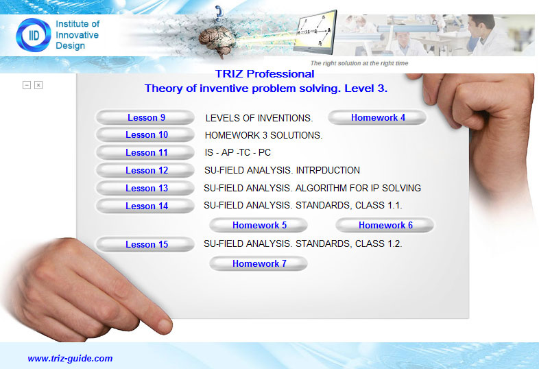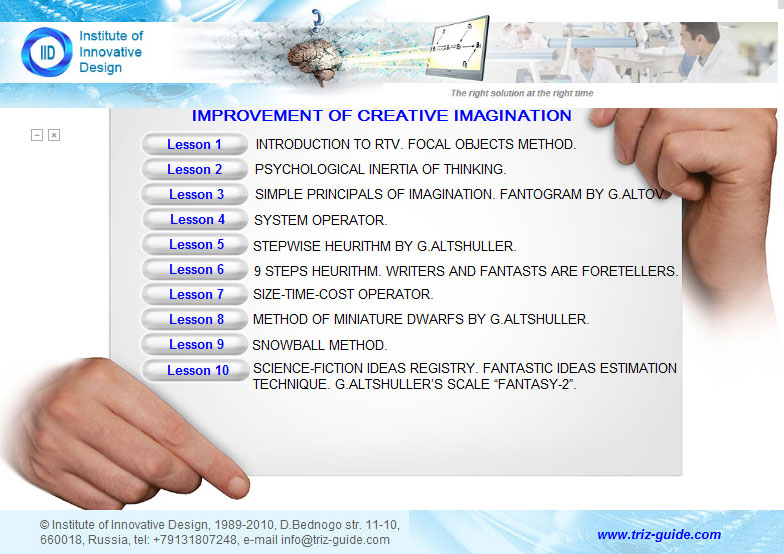 Institute of Innovative Design provides full set of tutorial on TRIZ, FCA, Innovative Design, Improvement of creative imagination by true TRIZ Master Dr.Y.Salamatov including DVD disks. There are 3 level of tutorial: