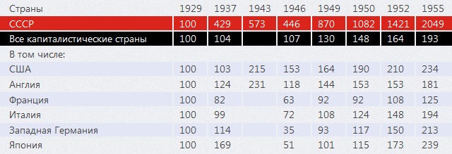 По поводу «невиданных» темпов развития у Америки... Просто посмотрим внимательно в табличку и сравним! В табличке показаны проценты роста относительно исходных ста процентов в 1929-м году.