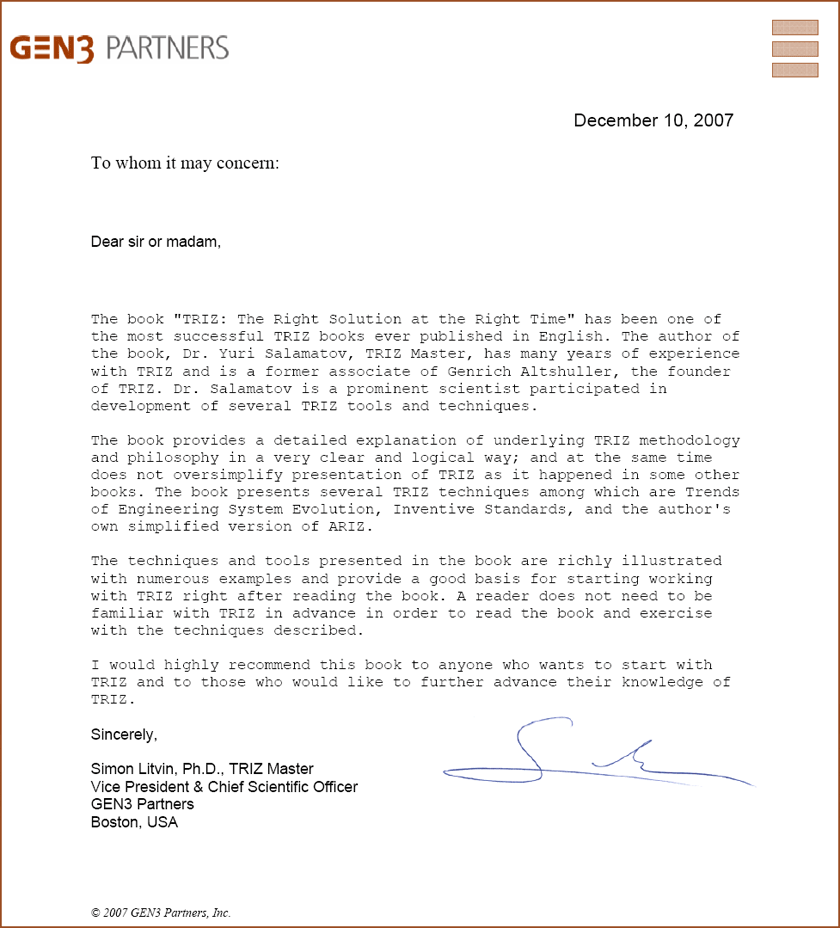 I did want to tell you that your book "TRIZ: The Right Solution at the Right Time" is fantastic! I recommend it to everyone.